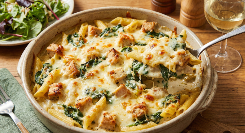 Inspired by classic creamy chicken and spinach pasta bakes popular in American and Italian home cooking, adapted from desi kitchens using local palak, affordable chicken from market, and everyday pasta with a simple white sauce instead of heavy cream. Draws from budget-friendly casserole recipes shared on family meal blogs, sites like Budget Bytes, and South Asian fusion ideas that emphasize one-pan comfort dishes. Freshly tailored here for warm, cheesy, nutritious meals that bring everyone to the table.