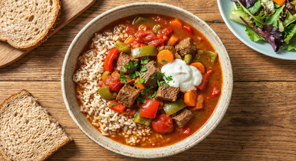 This lighter version of classic beef goulash uses lean beef, plenty of vegetables, and less oil for a comforting, flavorful stew that’s easier on the heart. Tender beef simmers with tomatoes, bell peppers, and paprika in a rich broth—perfect for winter evenings. Serve over brown rice or whole-wheat roti for a balanced, family-friendly meal that tastes indulgent but keeps calories and fat in check.