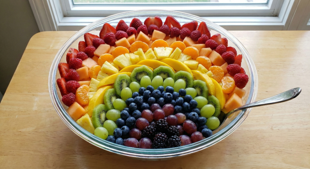 • Step 4: Add layers one color at a time: orange (mandarins/papaya), yellow (pineapple), green (grapes/kiwi), then blue/purple (blueberries/black grapes).